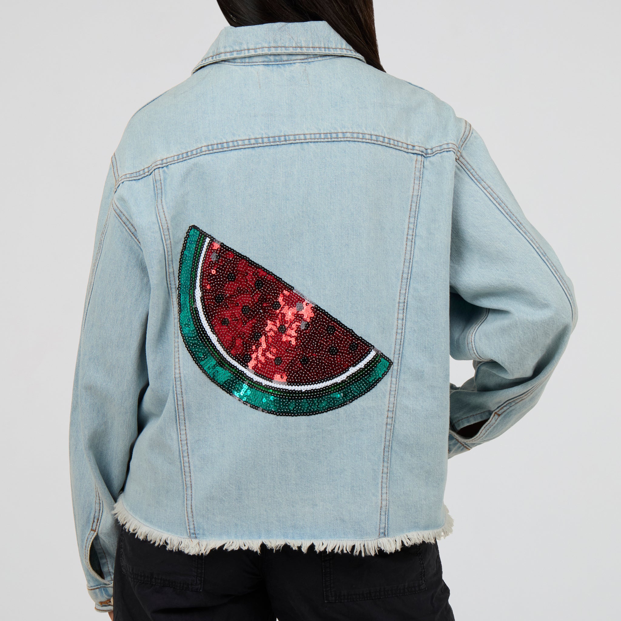 The Crimson Seed denim jacket comes with in light blue color and with a watermelon design on the back and a wide fit.