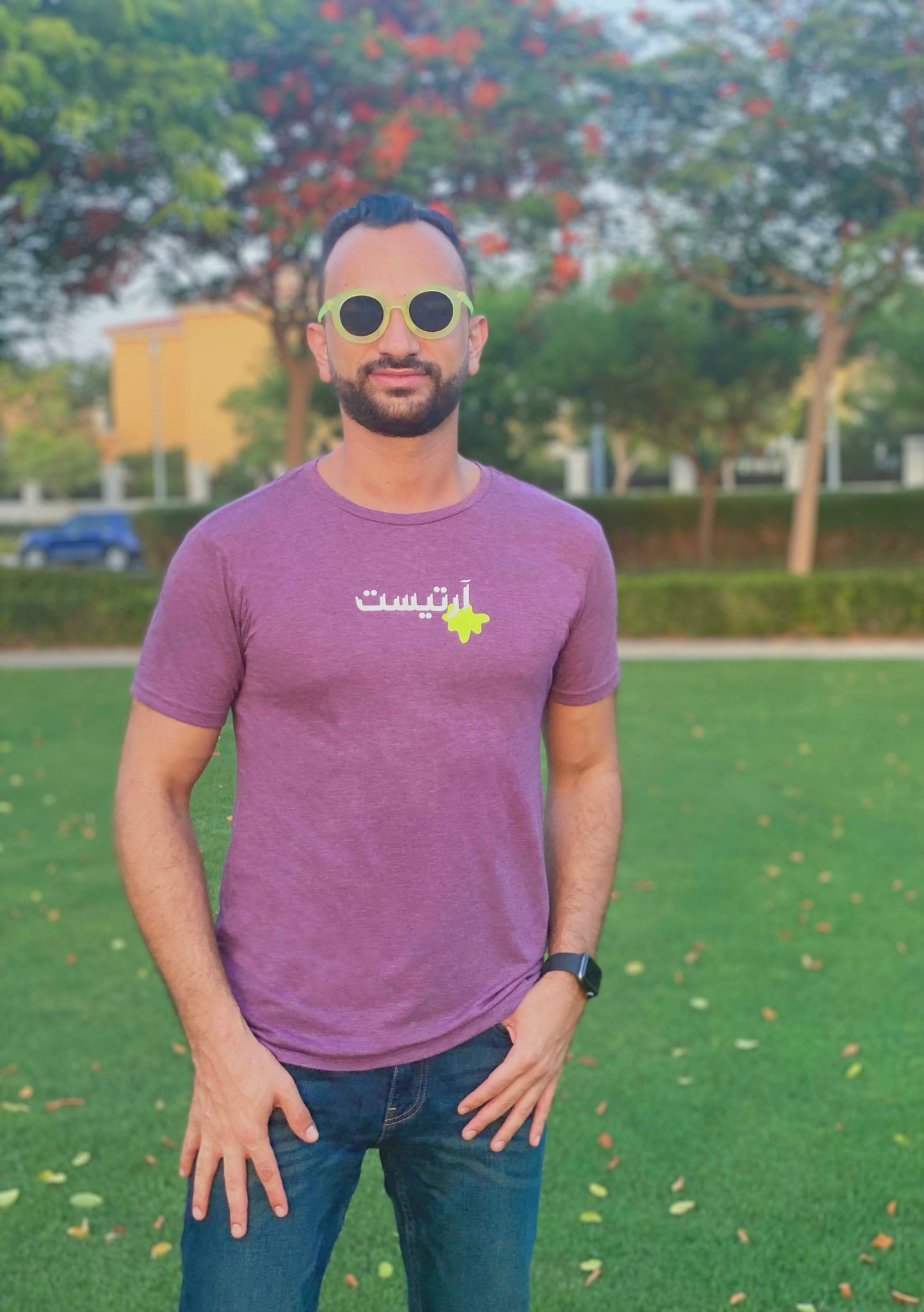 Purple organic cotton T-shirt with white writing and a neon yellow paint splash design.